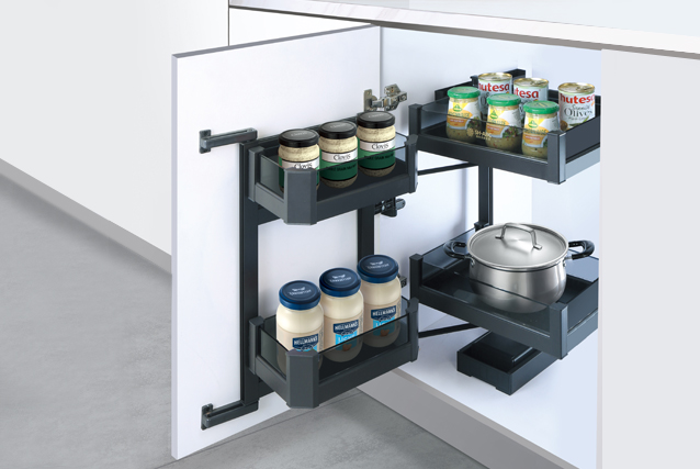 → 功能:丰富地柜收纳空间,告别杂乱台面,连动导轨,开一门而动全身。